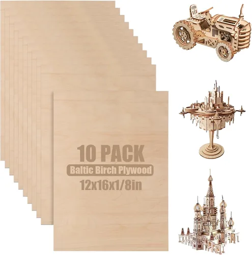 10 paquetes de madera contrachapada de abedul báltico: recibirás 10 paquetes de madera contrachapada de abedul báltico de 1/8, 16 x 12 pulgadas, cantidad suficiente para que puedas mecanizar en varios trabajos de manualidades lo que quieras. ¡Diviértete haciendo manualidades! Hoja de madera contrachapada de abedul báltico sin terminar de calidad: la madera contrachapada de abedul báltico de 1/8 pulgadas tiene el hermoso grano de madera de abedul natural y es la elección para una variedad de manualidades, proyectos en miniatura. Estas hojas de madera contrachapada están cortadas con láser, pulidas y sin deformaciones, y tienen durabilidad y estabilidad. Adecuado para manualidades en madera: la madera contrachapada fina de abedul báltico es adecuada para tallar madera, quemar madera, pintura, modelos de aviones, esculpir, modelado, cuerpos de modelos de manualidades y proyectos de arte de carpintería escolar. Adecuado para manualidades en madera. Fácil de cortar: 10 paquetes de madera contrachapada de 1/8 para corte láser son de 1/8 pulgadas de grosor, fáciles de cortar y adecuados para cortar y grabar con cuchillos utilitarios, sierras de desplazamiento y cuchillos láser o manualidades. Una tabla delgada para un corte de madera eficiente. Completa tus ideas de carpintería: la hoja de madera contrachapada de 1/8 te permite crear modelos imaginativos de carpintería, y se pueden realizar diseños de tallado. Como accesorios de películas, ciencia, modelos militares, juguetes, decoración de madera para el hogar, rompecabezas de alfabeto, etc.