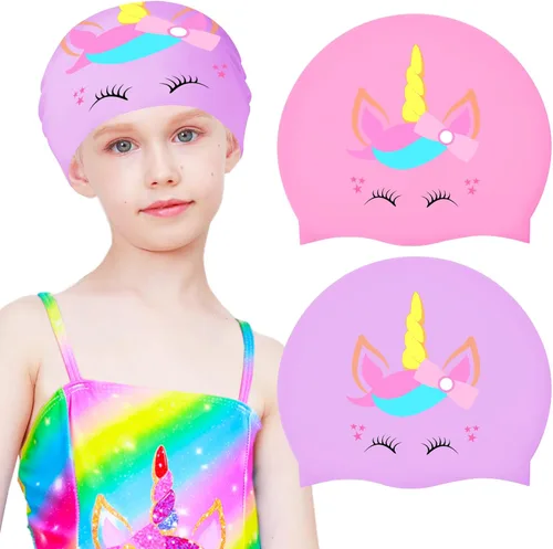 2 gorros de natación de silicona para niños y niñas (edad 3-12) cubre las orejas, gorro de baño impermeable para mantener el cabello seco, sombrero