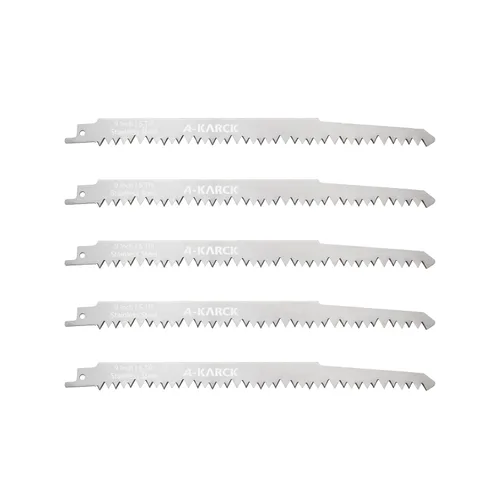 El paquete incluye: 5 hojas de sierra de 9 pulgadas (5 dientes por pulgada). Dos cuchillas de diferentes tamaños para satisfacer tus diversas necesidades. Duradero y seguro: hecho de acero inoxidable sin pintar de alta calidad. Fácil de mantener y fuerte resistencia a la corrosión. Ideal para cortar alimentos congelados, carne, carne de res, jamón curado, pavo, hueso, etc. No apto para metal. DIENTE DE SIERRA ESPECIAL: El perfil de diente bien diseñado es más agresivo y hace que el corte sea más rápido. Ahorra tiempo tanto como sea posible. ALMACENAMIENTO RAZONABLE: Todas las hojas de sierra se almacenan en una caja de plástico reutilizable para aislar eficazmente la humedad y evitar el óxido. Limpia la humedad de la superficie y los objetos extraños cuando lo guardes de nuevo COMPATIBILIDAD: Compatible con todas las principales marcas de sierras alternantes como DeWalt, Hitachi, Milwaukee, Makita, Ridgid, Skil, Ryobi, Black & Decker, Bosch, etc.