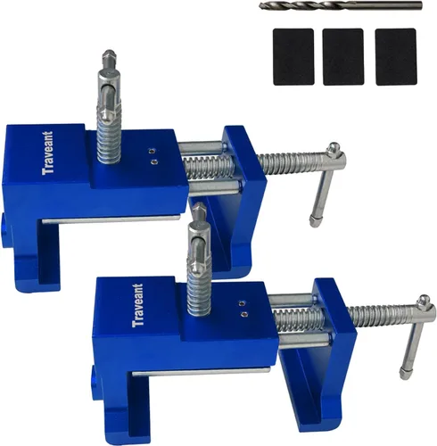 Alinee los marcos faciales rápidamente: Dos abrazaderas vienen en el conjunto, las coloca arriba e inferior en el marco frontal de los gabinetes contiguos lo que le permite juntarlas para un ajuste apretado. Imprescindible para instalar armarios por tu cuenta. Hecho para durar: el kit de abrazaderas de marco frontal viene completo con dos abrazaderas construidas de alta resistencia con husillos roscados y almohadillas de fieltro que no dañan El cuerpo de la abrazadera del gabinete y la mordaza lateral están hechos de acero fundido, y la placa de alineación está hecha de aleación de aluminio. Perfecto para instalar armarios y mantenerlos cuadrados. Perforación eficiente: Hay una guía de perforación de orificios para garantizar un orificio centrado que permite perforar un agujero piloto de 1/8 ", luego gire hacia abajo la guía para perforar su orificio de tornillo de 1/4 "sin tener que quitar la abrazadera. Nota: Asegúrese de que la guía de perforación esté en la posición bloqueada antes de perforar. Capacidad de sujeción: Las mordazas se abren a aproximadamente 4-3/8" de ancho, por lo que se adapta a casi cualquier estilo de gabinete. El ancho mínimo de la mandíbula es de 2 pulgadas. No solo para gabinetes: este juego de abrazaderas es una gran herramienta para instalar sus proyectos de gabinetes en remodelación. Pero no son solo para gabinetes, sino para cualquier tabla que desee asegurarse de que estén realmente al ras al colocarlas.