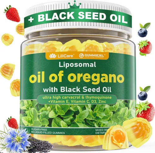 | Nombre del producto | Aceite de orégano con gomitas rellenas de aceite de semilla negra - Suministro de 2 meses - Alternativa de cápsulas de aceite de orégano, carvacrol y timoquinona con VE, VC, D3, zinc, forma liposomal |