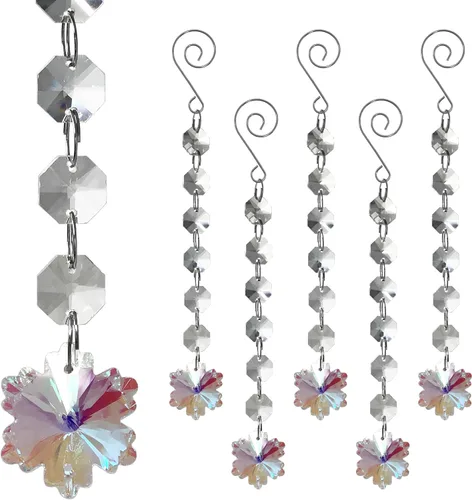 Cuerdas de copo de nieve de cristal para decoraciones Paquete de 6 hebras de cristal, cada una con 6 cristales octogonales y 1 dije transparente en forma de copo de nieve iridiscente (conectado por anillos de salto plateados y cromados). Cada cuerda viene con un gancho en S decorativo plateado. 8.25L Decoración de boda. Utilízalos como centros de mesa, guirnalda de mesa, cadena de cortina, lámpara de araña o detalles de cuentas. Ideal para usar como decoración colgante en tu árbol de Manzanita en tu recepción. Hilos de guirnalda de cristal. Conéctalos todos juntos para hacer guirnaldas que pueden añadir algo de brillo a tus fiestas o eventos navideños. Son perfectos para cualquier fiesta de cumpleaños de hadas o despedida de soltera. Se puede utilizar como adornos navideños, atrapasoles, decoraciones de fiesta o guirnalda de Navidad. Hebras colgantes de cuentas de cristal. Utilízalos para decorar candelabros o recepciones de bodas. Son versátiles y atrapan la cantidad justa de luz para que realmente brillen. Complemento perfecto para cualquiera de tus proyectos de fabricación de joyas o manualidades.