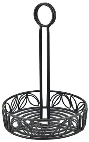 Estante para condimentos con diseño de hojas Hecho de material de hierro forjado Lo suficientemente grande como para manejar artículos estándar como sal y pimienta, salsa de tomate, mostaza y paquetes de azúcar Disponible en color negro Mide 6-1/4 pulgadas de diámetro por 9 pulgadas de altura