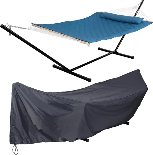 Hamaca para dos personas: tamaño de la cama de la hamaca de cuerda: 76 x 52 pulgadas, tamaño de la almohadilla de la hamaca: 77 x 55 pulgadas, tamaño de la almohada: 40 x 8.5 pulgadas. Diseñada para familias, con capacidad de peso de 450 libras, esta hamaca doble puede soportar a dos personas. Disfrutarás de un tiempo libre en la hamaca con tus seres queridos. Cómodo y duradero: la tela de poliéster acolchada de doble capa con guata interior de poliéster es suave, transpirable y duradera. El diseño especial de costura aumenta la belleza y practicidad del columpio de hamaca. Almohada de cabeza con relleno de polietileno extra que te ofrece una comodidad superior. La almohadilla de la hamaca es desmontable para una fácil limpieza. No se desvanece después de un uso prolongado. SOPORTE DE ACERO PARA HAMACAS: El soporte de hamaca está hecho de acero de calibre resistente, con caja fuerte, duradero y resistente a la intemperie. Se puede montar fácilmente en minutos sin necesidad de herramientas. Incluye una bolsa de revista y un portavasos, esta hamaca con soporte incluido es muy adecuada para leer, relajarse y descansar en el jardín, terraza, patio trasero, piscina o balcón. NUEVA ACTUALIZACIÓN: La funda de hamaca gruesa mejorada está hecha de tela de poliuretano 210D, con duradera y resistente a la intemperie. Sellado las costuras de la cubierta de la hamaca con sellador de costuras para que sea más impermeable. Se añade tela de malla en la ventilación para aumentar la resistencia al desgaste de la cubierta. Debido a esta funda para hamaca, tu hamaca estará protegida de la lluvia, la decoloración y la suciedad. Fácil de almacenar: tamaño de la funda de la hamaca: 151.18 pulgadas de largo x 53.94 pulgadas de ancho x 37 pulgadas de alto. Se adapta a soporte de hamaca de 11 a 12 pies y hamaca con barras separadoras de 55 pulgadas. Asas laterales para un fácil montaje y extracción. La funda de la hamaca se puede plegar y dejar a un lado cuando te relajas en la hamaca, luego desplegar para cubrir completamente tu hamaca cuando no esté en uso.