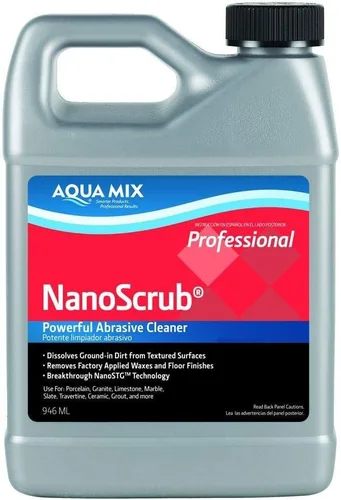 Aqua Mix NanoScrub es un limpiador en crema abrasivo que penetra debajo de las manchas difíciles Cuenta con NanoSTG: pequeñas partículas de tamaño nanométrico que disuelven las manchas y las levantan Elimina ceras y acabados de pisos, selladores de recubrimiento, residuos de lechada, epoxi y residuos de sellador Elimina marcas de goma y lápiz, depósitos minerales ligeros y suciedad molida Muele la neblina de la lechada y los recubrimientos sin dañar la superficie