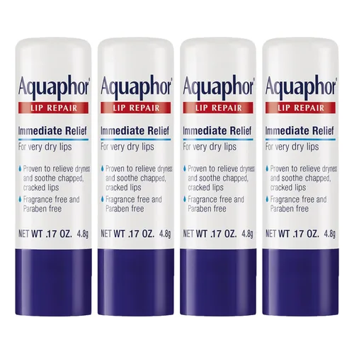 Encuentra humedad duradera de la marca #1 recomendada por dermatólogos para el cuidado de labios con las barras de reparación de labios Aquaphor La crema hidratante labial Aquaphor Lip Repair alivia inmediatamente la sequedad y alivia los labios muy agrietados y agrietados. Específicamente formulado para labios sensibles y labios agrietados muy secos, este bálsamo labial hidratante sella la humedad y proporciona un alivio eficaz y duradero, para que los labios se vean y se sientan más saludables. Formulado con una combinación especial de vitaminas nutritivas, humectantes, manteca de karité y aceite de jojoba, este bálsamo labial Aquaphor deja los labios suaves y cómodos. Este paquete de bálsamo labial a granel incluye cuatro barras de bálsamo labial Aquaphor para que siempre puedas tener uno cerca, para mantener los labios con el mejor aspecto. La barra de reparación de labios Aquaphor se desliza fácilmente y es ideal para su uso en condiciones secas, frías o ventosas. Aplique este bálsamo labial hidratante generosamente sobre los labios secos tantas veces como sea necesario. Cada uno de los ingredientes de los productos de los labios ha sido probado y aprobado para su calidad y seguridad.