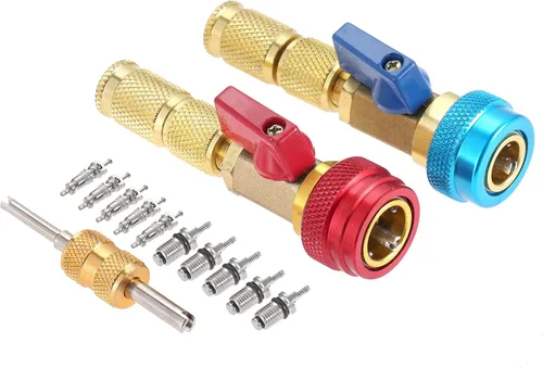 Kit de herramientas útiles: Este kit de herramientas de extracción de núcleo de válvula incluye instalador de extracción rápida de núcleo de válvula de alta presión R134a (rojo) y R134a de baja presión (azul) para remover rápidamente, 1 herramienta de extracción de núcleo de doble cabeza, 5 núcleos de válvula R134a y 5 núcleos de válvula 5V1. Acoplador rápido de alta presión y baja: Acoplador de alta presión (rojo), con diámetro interior de 0.630 in, y acoplador de baja presión (azul) con diámetro interior de 0.512 in. Fácil de instalar: la herramienta de extracción de núcleo de la herramienta de extracción de núcleo de la válvula hace que se inserte fácilmente en el núcleo interno de la válvula y controle el núcleo. Le salvó de tener que evacuar el sistema de aire acondicionado del refrigerante, lo que le permite solo tener que agregar una cantidad muy pequeña. Diseño de pozo: Válvula de bola de acero inoxidable incorporada: la válvula de bola bien diseñada y el extractor roscado permiten al usuario bloquear el sistema mientras cambia los núcleos de las válvulas, lo que permite que no haya pérdida de refrigerante. Aupoko Los juegos de instalación de extracción rápida de núcleo de válvula de servicio están hechos de aleación de latón de alta calidad, duran mucho tiempo; fácil de operar e instalar, sellado fuerte para mayor durabilidad y seguridad. Ofrecemos 12 meses de garantía, si hay alguna pregunta, no dude en contactarnos.