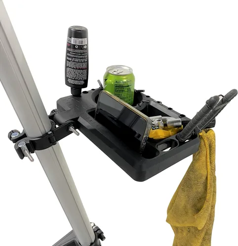 CREANDO CONFIANZA: Esta bandeja de herramientas universal le permite abordar el mantenimiento de su bicicleta con confianza. Este producto contiene todas las herramientas de reparación esenciales, incluyendo un espacio para sus herramientas, teléfono, bebida, trapo, etc. Alta calidad: nuestra bandeja universal para herramientas está hecha de plástico de alta calidad que la hace súper duradera y para durar para siempre. MULTIFUNCIONAL: Nuestro producto está hecho para ser un ajuste universal, que funciona con diámetros de tubo de 1.25"-2". Se adapta a tubos redondos, ovalados y con forma de lágrima. Esta bandeja de herramientas se puede poner en modo de almacenamiento de montaje en pared, lo que ayuda a mantener la bandeja cargada con herramientas. La abrazadera se ajusta 90 grados para su uso en el modo de soporte de reparación de montaje en pared.