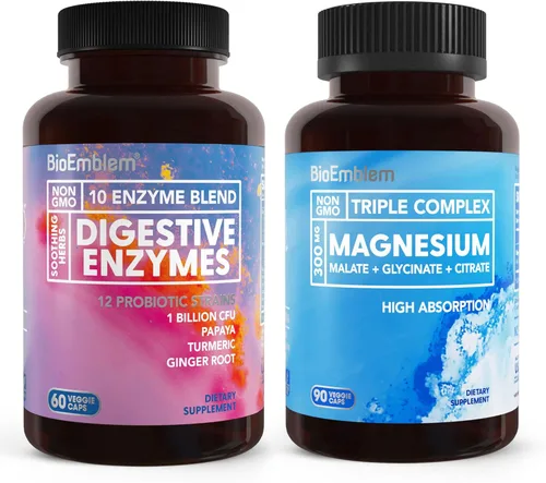 Máxima absorción y potente suplemento de magnesio: el complejo triple de magnesio BioEmblem cuenta con 300 mg de tres tipos de magnesio puro (glicinato, malato, citrato). Cada uno es quelato o altamente absorbible para una biodisponibilidad máxima. Nuestra fórmula es fácil para el estómago y "no tamponada", lo que significa que esta mezcla no se diluye con óxido de magnesio menos costoso y menos absorbible. * Apoya nervios saludables: El magnesio, especialmente en forma de glicinato mag, es un nutriente esencial que apoya la función muscular y nerviosa saludable. Esto puede ayudar con los músculos y las piernas por la noche, la salud del cerebro* Promueve la salud del corazón y la producción de energía: Como cofactor en cientos de reacciones enzimáticas, el magnesio, especialmente el malato de magnesio, apoya la ingesta de nutrientes para la producción de energía celular. Los suplementos de magnesio también ayudan a apoyar la salud cardiovascular en general. * 10 enzimas para el intestino feliz: esta fórmula de triple acción, cuenta con una potente dosis de 125 mg de enzimas esenciales como amilasa, proteasa y lipasa, para descomponer los carbohidratos, proteínas y grasas para reducir las molestias en las comidas y menos hinchazón. Al optimizar la descomposición de nutrientes, nuestra poderosa mezcla de enzimas mejora la absorción, asegurando que tu cuerpo reciba todos los beneficios de cada comida. * 1 mil millones de probióticos UFC para la digestión: 12 cepas probióticas meticulosamente seleccionadas para ofrecer un impulso digestivo integral y fomentar un ambiente intestinal armonioso. Al nutrir un microbioma próspero, nuestras enzimas digestivas con probióticos ayudan con el alivio de los gases y la hinchazón, promueve la regularidad y te ayuda a sentirte mejor. *