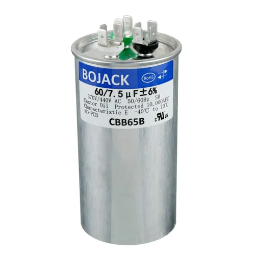 BOJACK 60+7.5uF ±6% 370V/440V CBB65 Condensador de arranque circular de doble ejecución Dimensión del condensador: Diámetro 2.36 pulgadas, Altura 4.53 pulgadas Temperatura de funcionamiento: -40.0 °F a +158.0 °F/-104℉to+158℉ Clasificación de seguridad: 10,000 AFC Tres terminales en la parte superior están etiquetados como "Herm"/"H" para el motor del compresor, "Fan"/"F" para el ventilador, y "C" para la línea común.
