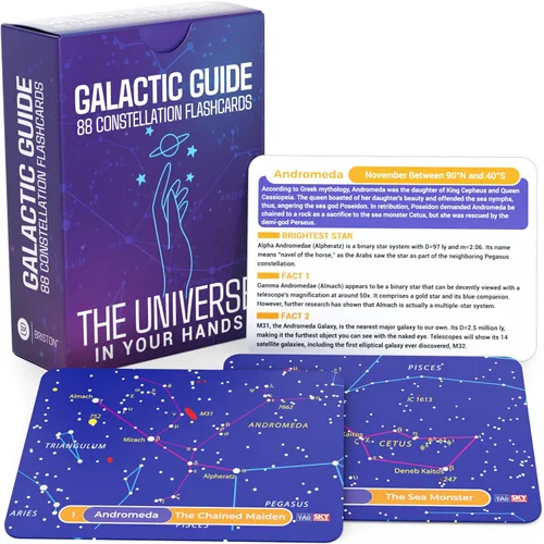 Tarjetas flash de astronomía: explora las 88 constelaciones con tarjetas didácticas de la Guía Galáctica de Briston con vívidos mapas de estrellas, nombres de constelaciones y divertidos hechos astronómicos que hacen que estudiar el cielo nocturno sea atractivo y educativo para todas las edades. Duradera y resistente al agua: cada tarjeta constelación está hecha con cartulina premium de 350 GSM, laminación brillante y bordes curvos para mayor durabilidad y fácil manejo, perfecta para aula, escuela en casa o sesiones de observación de estrellas al aire libre. Aprendizaje STEM hecho divertido: estas tarjetas educativas de astronomía promueven el aprendizaje STEM a través de diagramas detallados, información de estrellas y mitología de constelaciones, lo que las convierte en un recurso perfecto para estudiantes y entusiastas de la astronomía. Portátil y fácil de usar: compactas y fáciles de transportar, estas tarjetas de 3.5 x 2.5 pulgadas caben fácilmente en tu bolso o bolsillo. Ideal para estudio en solitario, aulas o clubes de astronomía: lleva tu aprendizaje a cualquier lugar bajo las estrellas. Regalo perfecto para los amantes del espacio: diseñado para niños, adolescentes y adultos, este juego de tarjetas de constelación es un regalo único y reflexivo para los amantes de la ciencia, profesores o cualquier persona apasionada por explorar el universo.