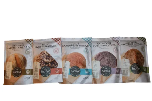 German Gluten Free Bread Mixes as a 5 piece value pack. 1. German Gluten Free Rye Bread Mix Pumpernickel Style 2. German Gluten Free Protein Bread Mix 3. German Gluten Free Farmer's Bread Mix 4. German Gluten Free Multigrain Bread Mix 5. German Gluten Free Sandwich Bread Mix