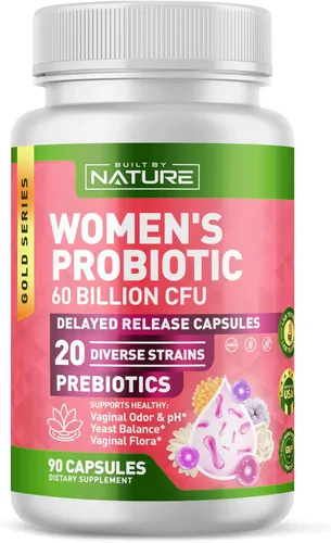Built By Nature Probiotic for Women cuenta con 60 mil millones de UFC de 20 diversas cepas probióticas más prebióticos para ayudar a equilibrar tu tracto digestivo, fortalecer el apoyo inmunológico y apoyar el bienestar vaginal general. Formulado en cápsulas de liberación retardada para maximizar la eficacia, este suplemento no transgénico es ideal para ambas mujeres que buscan un probiótico eficaz.