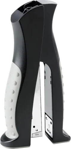 El diseño ergonómico de pie utiliza menos espacio en el escritorio que las grapadoras de escritorio convencionales El yunque giratorio permite engrapar y fijar Cuenta con cómodas empuñaduras y piezas de trabajo totalmente metálicas para mayor durabilidad Carga una tira completa de grapas estándar Grapas de hasta 20 hojas de papel de 2.82 oz/m²