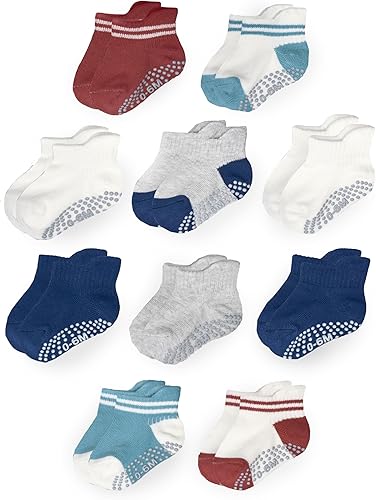 Diseño superior de agarre de cobertura completa: los agarres de goma natural abarcan toda la suela desde el talón hasta los dedos, ofreciendo una tracción inmejorable en superficies lisas y resbaladizas. Diseñados para mantener seguros a los bebés y niños pequeños que gatean, estos calcetines ayudan a prevenir resbalones y caídas durante el juego y los primeros pasos. Comodidad de algodón para pieles sensibles: Hechas de algodón natural, estas medias son excepcionalmente suaves y transpirables, haciéndolas perfectas para pieles sensibles. El diseño ergonómico elástico de 360° garantiza un ajuste cómodo y seguro que se adapta a los pies de tu bebé, proporcionando comodidad durante todo el día y libertad de movimiento. Diseño para Poner y Quitar Fácilmente que se Mantiene en su Lugar: El práctico diseño con lengüeta facilita poner los calcetines, incluso en los pies más inquietos de los pequeños. Las zonas elásticas estratégicamente ubicadas aseguran que los calcetines se mantengan en su lugar sin deslizarse, brindando tranquilidad a los padres y un ajuste sin complicaciones a los bebés. Durables y fáciles de cuidar: Lavables a máquina y hechos para durar, estos calcetines mantienen su forma y suavidad lavado tras lavado. Simplemente mételos en agua fría y sécalos en secadora a baja temperatura para mantenerlos como nuevos. Colores elegantes y tallas versátiles: Disponibles en una variedad de colores y estampados, estos calcetines son fáciles de combinar con cualquier atuendo. Los tamaños incluyen 0-6 meses, 6-12 meses, 12-24 meses, 2T-4T y 4T-5T, asegurando el ajuste perfecto para cada etapa del viaje de tu pequeño.
