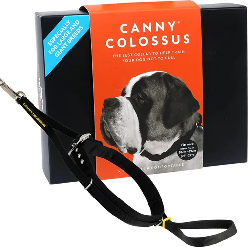 Diseñado para razas gigantes: disfruta de paseos tranquilos y controlados con tu perro de raza gigante. El collar de cabeza Canny Colossus sin tirones deja de tirar suavemente, ayudando a tu perro a caminar de forma segura a tu lado sin frustración ni miedo. Diseño amable y humano: el accesorio patentado detrás de la cabeza de la correa evita la presión en los ojos o sacudir la cabeza hacia un lado. Un suave lazo para la nariz permite que tu perro respire, jale y beba libremente. Fácil de colocar y entrenar con: Rápido de poner y ajustar, al igual que un collar de perro normal, con una hebilla de acero segura. El suave sistema de presión y liberación enseña modales de correa: retire la banda nasal cuando no sea necesario para reforzar el caminar con correa suelta. A prueba de fugas y seguro: hebilla de acero niquelado y accesorio de correa en la parte posterior de la cabeza evitan que tu perro saque el collar. Tu correa se mantiene fijada de forma segura para un control total durante caminatas o sesiones de entrenamiento. ENCUENTRA EL TAMAÑO CORRECTO: Mide el cuello de tu perro justo detrás de las orejas. Si estás entre tallas, elige una talla más pequeña a un collar Canny para un ajuste cómodo. El Canny Colossus es una ayuda de entrenamiento, no una solución rápida, funciona mejor cuando se usa constantemente como parte del entrenamiento de correa.