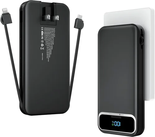 Cargador portátil ligero de 12000 mAh con cables integrados y enchufe de pared de CA, batería de carga rápida PD20W USB-C, pantalla LED, cargador