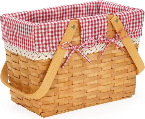 CESTA CON MANGO FUERTE: Esta cesta con 2 asas hace una cesta más resistente para llevar en uso y ahorra espacio en almacenamiento. Ideal para césped, picnics, camping, conciertos al aire libre, portones traseros, estadios, eventos deportivos y cualquier otro momento en el que estés pasando el rato afuera. Tamaño bonito: gran tamaño pequeño para acampar, senderismo, picnics y navegación. Longitud: 12.2 pulgadas; ancho: 7 pulgadas; altura: 9.8 pulgadas. Es una buena cesta de regalo suficiente para guardar dos velas, máscaras faciales de spa, maquillaje, esmalte de uñas. Multiusos: cesta Toto; cesta de frutas; cesta de coser; cesta de almacenamiento de baño; cesta de regalo de huevos de Pascua; cesta de regalo de dulces de Navidad; cesta de hongos, cesta de flores, cesta de campana de equitación roja. Material de precio: nuestra cesta de almacenamiento está hecha de virutas de madera de primera calidad. trazador de líneas: estilo rural de los E.E.U.U., forro de cuadros rojo y blanco, simple y hermoso. Regalo perfecto: la cesta de astillas de madera es un gran regalo para cualquier época del año. Decoración perfecta para una casa, condominio y mantener en el maletero de tu automóvil. Además, es un regalo inteligente para aniversarios, vacaciones, festivales, Navidad, Día de Acción de Gracias, Día de la Madre, Día del Padre, Día de San Valentín y cumpleaños.