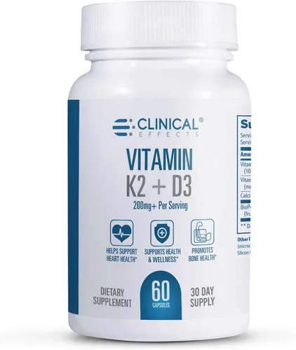 Clinical Effects Vitamina K2 + D3 - Suplemento vitamínico K2 + D3 con extracto de pimienta negra bioperina y calcio para apoyo a la salud ósea y