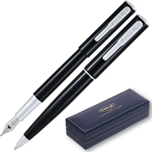 Conklin Coronet - Juego de bolígrafos (bolígrafo y fuente), color negro Presentamos la Colección Coronet, un bolígrafo y pluma estilográfica minimalista y moderno en colores sólidos con un acabado metálico de alto brillo. Con el barril hecho a mano con barras de latón macizo y con una tapa de acero inoxidable recubierta con laca vibrante, la colección Coronet es sin duda tan flexible y fuerte como hermosa. Con un diseño superior casi plano y cuerpo delgado, cada bolígrafo está montado a mano y combinado con detalles plateados, así como un clásico clip Conklin en forma de L. Peso medio, y un tamaño bastante grande pero no demasiado grande, este bolígrafo seguramente complacerá cuando se trata de la mano. Debido al proceso de lacado, cada bolígrafo Coronet cuenta con un acabado metálico de alto brillo. Características Color de la pluma: Negro Clip: Clásico en forma de L Color sólido con un acabado metálico de alto brillo. Longitud de la pluma: 5.50" (140 mm) Grosor de la banda central del bolígrafo: 0.48" (12.5 mm) Diseño superior plano: viene con diseño superior plano y cuerpo delgado cómodo para cualquier estilo de escritura Barril de latón macizo: Barril duradero de barras de latón macizo de acero inoxidable recubierto con laca vibrante Clip de metal con detalles plateados: clip de metal 100% con detalles plateados e inscripción Conklin Bolígrafo Coronet Color de tinta de recarga: Negro Tamaño de la punta de recarga: punta fina Peso de la pluma: 1.1 onzas (1.20 oz) Activación de giro: fácil de usar y activación segura con mecanismo de giro suave Recambio de estilo Parker: compatible con el recambio estándar de estilo Parker de forma G1 incluye Pluma estilográfica Coronet Tamaño de la punta: punta fina Peso de la pluma: 1.2 onzas (1.23 oz) Pluma: Punta fina de alta calidad tamaño JOWO Nib, fabricado en Alemania Cartuchos internacionales: Compatible con cartuchos de pluma estilográfica estándar Incluye convertidor de tinta: viene con convertidor de tinta de fuente estándar, 1 cartucho de tinta azul y 1 cartucho de tinta negra.