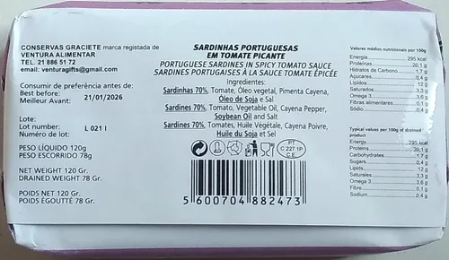 Conservas GRACIETE, una marca de: Ventura Alimentar - Portugal Sardina entera enlatada gourmet en salsa picante de tomate 4.23oz / 120gr (paquete de 5 latas) Producido en Portugal, embalado a mano