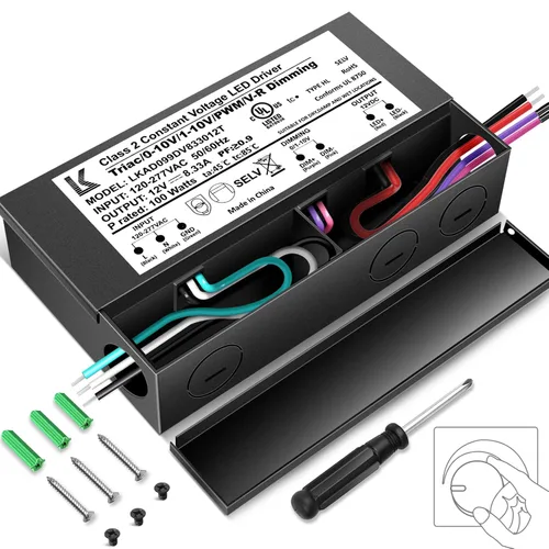 Controlador LED regulable 5 en 1: entrada: 110 V (120 V-277 VAC), 50/60 Hz. Salida: 12V 8.33A 100W, ta: 113.0 °F tc: 185.0 °F. Ideal para luces LED de 12 V, luces empotradas y sistemas de iluminación inteligente en configuraciones residenciales y comerciales Compatibilidad universal: controlador led regulable de 12 V funciona con atenuación 5 en 1: Triac/0-10V/1-10V/ELV/MLV/PWM/V-R, y es compatible con la mayoría de los atenuadores de pared de CA, incluidos Lutron y Leviton. Permite una atenuación suave y sin parpadeo del 100% al 0% para crear el ambiente perfecto Especificaciones: El transformador LED de 12V 100W cuenta con certificación UL, tipo HL, SELV, RoHS, cumplimiento, lo que garantiza altos estándares de seguridad y calidad. También está clasificado para su uso en lugares húmedos, por lo que es adecuado para diversas aplicaciones en interiores y exteriores Fácil instalación: La fuente de alimentación LED está diseñada con orificios de cableado en tres lados para una instalación flexible. Simplemente abra la caja de terminales y conecte los cables correspondientes al controlador (diagrama de cableado proporcionado como referencia). Se incluye un destornillador, tornillos y tuercas para un fácil montaje e instalación de la suspensión Protección incorporada: Este controlador LED regulable con caja de conexiones está equipado con características de seguridad esenciales, incluyendo protección contra cortocircuitos, sobrecarga y sobretemperatura. Estas protecciones integradas garantizan un rendimiento confiable, protegen tu equipo y prolongan la vida útil del controlador regulable IP67 impermeable de 12 V evitando posibles daños causados por fallas eléctricas o calor excesivo