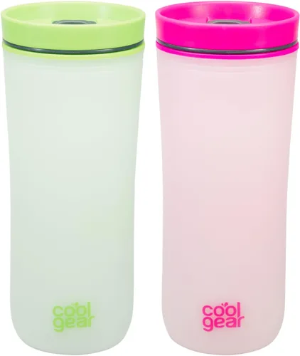 COOL GEAR Paquete de 2 tazas de viaje de café Sumatra de 16 onzas con tapa deslizante resistente a derrames | Vaso de color reutilizable - Rosa/Verde