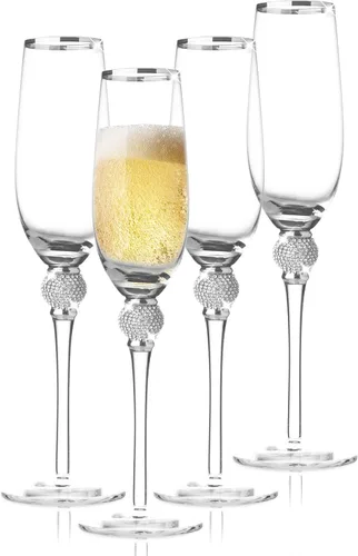 Eleva cada tostada: fabricado con cristal sin plomo, estas copas de champán con borde plateado y diseño con tachuelas de diamante añaden un toque de lujo a tus celebraciones, haciendo de cada brindis una experiencia verdaderamente elegante Diseño sofisticado: la forma de flauta atemporal, la llamativa silueta moderna, el diseño de diamantes de imitación y los bordes chapados en plata de estas flautas de champán de vidrio aportan un aire de sofisticación a tus fiestas y ocasiones especiales Exquisita mejora del aroma: el cristal sin plomo mejora el aroma de tu burbujeante favorito, lo que te permite saborear cada nota con cada sorbo Ideal para momentos memorables: con una altura de 11 pulgadas, nuestro juego de copas de champán es perfecto para brindar a los novios, añadiendo una capa adicional de encanto a bodas y otras celebraciones alegres OPCIÓN DE REGALO PENSAMIENTO: Regala elegancia con estas copas de champán de cristal, un gesto personalizado para bodas, aniversarios, cumpleaños y mucho más