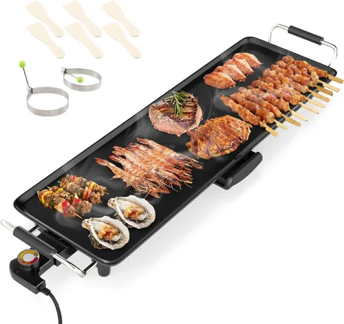 Amplia superficie antiadherente: con un área de cocción de 27 "x 9", esta plancha eléctrica le permite cocinar comidas para grupos de 6-8. La superficie antiadherente es fácil de limpiar. Además, la bandeja de goteo incluida y las 6 espátulas de madera garantizan una preparación suave de los alimentos, mejorando tu experiencia culinaria. Fácil control de temperatura: esta parrilla de barbacoa de mesa viene con un controlador con 4 temperaturas ajustables: 1ª marcha (200 ℉, 1.5 minutos), 2ª marcha (250 ℉, 3 minutos), 3ª marcha (300 ℉, 5 minutos), 4ª marcha (425 ℉, 12 minutos). Ya sea cocinar panqueques, papas, bistec, tocino o pescado, puede encontrar el entorno óptimo. Rendimiento excepcional: Equipado con un termostato incorporado, la parrilla eléctrica promete un calentamiento rápido y una alta eficiencia. Precalienta por 1,5 minutos de antelación. La función de protección contra sobrecalentamiento garantiza la seguridad al apagar automáticamente la calefacción cuando la temperatura supera los límites de seguridad. Aluminio estampado seleccionado: Esta plancha larga está construida con aluminio estampado que consiste en una capa conductora térmica, capa de sustrato de aleación, capa de desgaste reforzada y revestimiento antiadherente. Libre de PFOA/PFAS, la plancha eléctrica está certificada por UL y ETL para mayor confiabilidad. Uso versátil en interiores y exteriores: desde organizar una barbacoa familiar hasta embarcarse en un viaje de campamento, esta parrilla teppanyaki satisface sus diferentes necesidades. Las asas antiquemaduras te permiten moverlo con facilidad, mientras que las almohadillas antideslizantes se adaptan a varias mesas.