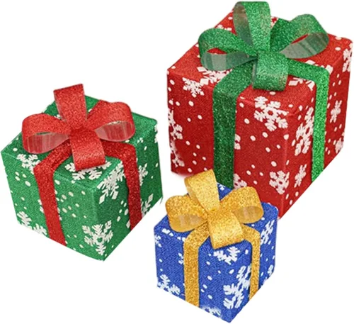 Calidad del material estable: hechas de poliéster de alta calidad y tela PTE, estas decoraciones navideñas garantizan un uso duradero con una sensación premium y elegante. Fácil colocación en interiores: ligeras y portátiles, estas cajas de regalo iluminadas se pueden colocar sin esfuerzo en pisos, escritorios o estantes para mejorar tu decoración festiva. Uso multiescena: ideal para la decoración de vacaciones en varios entornos, incluyendo escuelas, bares, oficinas o tiendas minoristas, elevando el espíritu estacional y llamando la atención. Brillo LED festivo: luces LED brillantes y de bajo consumo iluminan las cajas de regalo de 3 piezas, creando un ambiente navideño cálido y acogedor perfecto para hogares, tiendas y oficinas. Tamaños de exhibición versátiles: con cajas de 6, 8 y 10 pulgadas, este juego proporciona opciones de decoración flexibles para complementar cualquier espacio o configuración de árbol de Navidad.