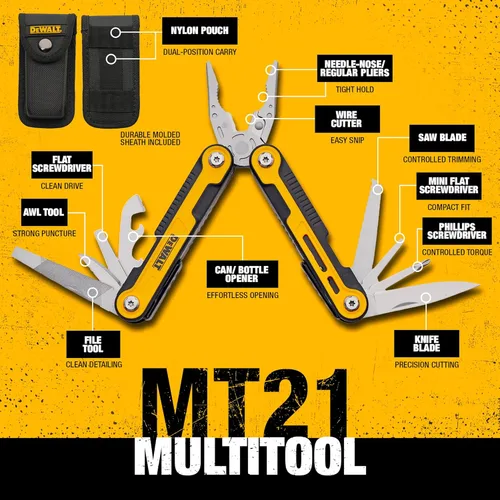 Multiherramienta 11 en 1 para comerciantes: Equipado con alicates de punta de aguja, alicates regulares, cortador de alambre, hoja de cuchillo, hoja de sierra, archivo, herramienta de punzón, destornilladores Phillips y planos, abrebotellas y latas. Construido para el lugar de trabajo: construcción de acero inoxidable resistente diseñada para soportar duras condiciones en el lugar de trabajo, ideal para contratistas, electricistas y equipos de construcción. Compacto y listo para cinturón de herramientas: se pliega hasta 4 pulgadas, se abre a 6 pulgadas; cabe fácilmente en bolsillos, bolsas de herramientas o su funda montada en el cinturón. Incluye funda de cinturón moldeada: viene con una funda moldeada para un acceso seguro y sobre la marcha, perfecto para el comercio rápido y el trabajo de campo. Dewalt Durabilidad garantizada: rendimiento confiable de DEWALT integrado en una herramienta compacta todo en uno para los oficios más difíciles y las tareas diarias.