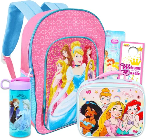 Disney Juego de mochila y lonchera de princesa para niñas, paquete con bolsa escolar de princesa, bolsa de almuerzo, calcomanías y botella de agua de princesa para niños (suministros escolares de princesa). Este juego de suministros escolares de Disney Princess incluye una mochila con correas ajustables y una lonchera con coloridas obras de arte de Ariel, Bella, Cenicienta, Rapunzel y más. Esta mochila de princesa tiene mucho espacio para que tu hijo pueda llevar lo que necesite a la escuela, una fiesta de pijamas o a cualquier otro lugar. Este juego incluye una botella de agua Frozen de 16.5 onzas con Anna y Elsa. Esta lonchera aislada de princesa Disney mantiene la comida a la temperatura ideal durante horas y combina bien con otros productos de Disney Princess. ¡Muestra a tus princesas favoritas con estilo! La mochila Disney Princesses con licencia oficial para niñas también incluye calcomanías de princesa y un colgador de puerta de castillo de princesa Beach Kids.