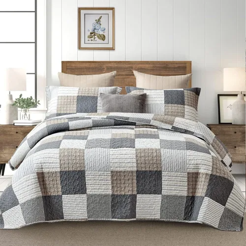 Edredón de tamaño King, 100% algodón, edredón de tamaño King, color gris marrón, de retazos, ligero, reversible, para todas las estaciones, 3 piezas