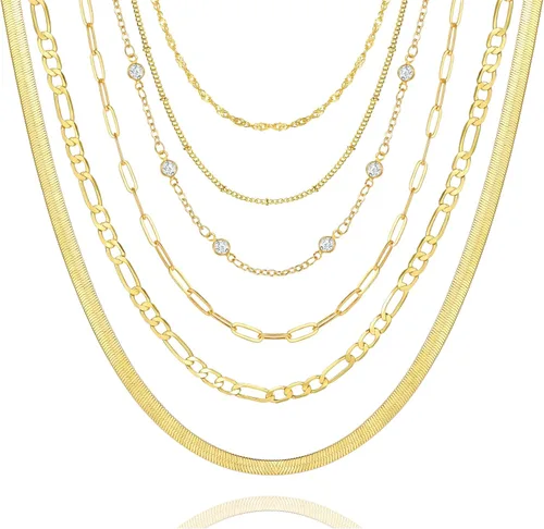 FAXHION 6 collares de cadena de oro en capas para mujer, collar de gargantilla de oro de 18 quilates delicado con circonita cúbica, juego de collar