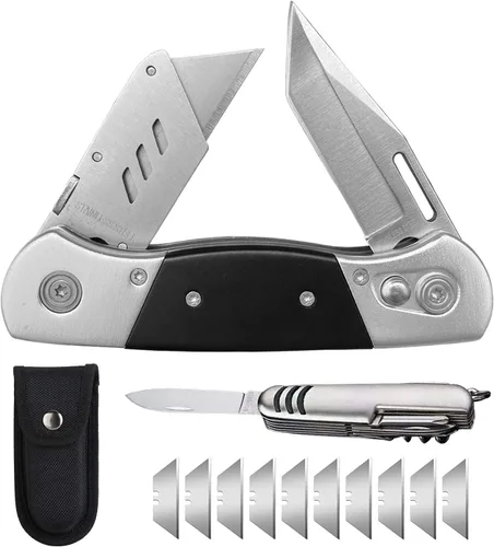 • POWERFUL UTILITY KNIFE: Designed with cool dual blade, get more task done with our durable utility knife! A must-have multiPurpose tool for the family. SAFE&RELIABLE: Ergonomic curve handle fits your hands and provides more security and comfort grip for you. 3 screws securely hold the boxcutter blade, no need to worry about the blade slipping while working. QUICK-CHANGE MECHANISM: Easily release the blade for replacement. Compatible with most standard SK5 utility blades for extra convenience. (10 blades included) KNIFE SHEATH INCLUED: High quality nylon pouch for secure storage and quick access on belts. Slide into your sheath, it ready to work anytime. Our utility knife is your go-to tool for projects around your house, on the work, or outdoor. MULTI-FUNCTION TOOL: Ideal for cutting thick materials – As wallpaper, Corrugated cardboard, Carpets, Rope, Fabrics, Thin wood, Laminates, Leather, Plastics, Rebber, Scoring sheet rock, Carton. A multitool pocket knife is included, to help you complete tasks faster and more conveniently.