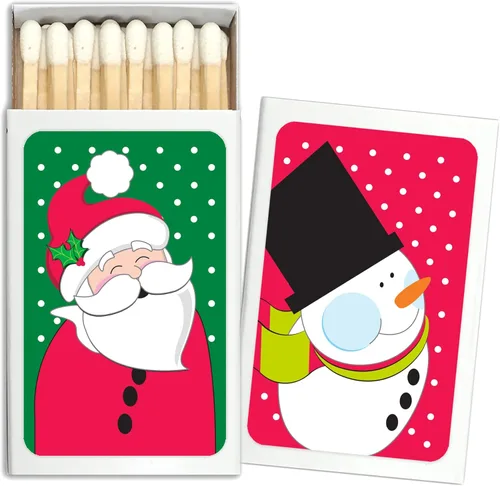 El juego de 50 cajas de cerillas incluye 25 Papá Noel Jolly y 25 adorables muñecos de nieve (etiquetados en un lado de las cajas de fósforo) Ideal para regalo de Navidad y vacaciones. El toque perfecto para tu regalo de vela de Navidad. El color de la punta puede variar entre puntas blancas o rojas. Estas cajas de cerillas (2.25 pulgadas de ancho x 1.375 pulgadas de alto) se venden en juegos de 50. Cada caja de cerillas contiene aproximadamente 18 palos de madera Fabricado con orgullo en los Estados Unidos. No requiere montaje