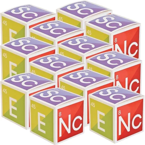 Estas cajas de golosinas son suministros perfectos para fiestas de cumpleaños para una próxima velada científica. Cargarlos llenos de golosinas que aumentan la capacidad intelectual o favores de fiesta que ayudarán a los pequeños Einstein a probar sus hipótesis una y otra vez. Impresas con elementos periódicos de colores brillantes, estas cajas también son una gran adición a la decoración de fiestas y se pueden llenar con divertidos aperitivos y exhibir en el buffet. Papel 4 1/2" 1 docena Requiere montaje sencillo