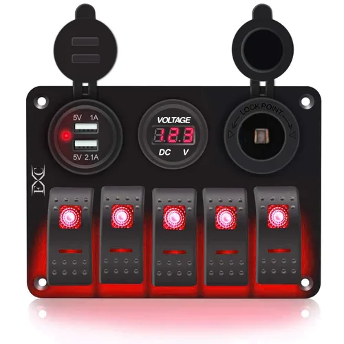Panel de interruptor de 5 bandas: panel de interruptor LED rojo de 5 bandas con toma de cigarrillo de 12 V, voltmer y salida de cargador USB doble, ideal para todo tipo de control de circuito, necesidades de carga. Se puede utilizar para controlar cualquier aparato eléctrico del vehículo. Ajuste universal para vehículos de 12 V-24 V, ampliamente aplicable para camiones, jeeps, remolques, caravanas, autobús, barcos marinos, yates, etc. Resistente y duradero: certificado CE y ROHS. Hecho de panel de aluminio de alta calidad, interruptores ABS y PC de alta calidad y pines bien conductores; construcción de grado marino e impermeable IP66. Adopta un panel de aluminio de alta calidad, resistente a los arañazos y a la corrosión. 【Haz tu panel de interruptor】Panel de interruptores iluminados de aluminio azul de 5 bandas de 12 V con calcomanías de letreros de bricolaje, puedes personalizar estos interruptores según tus demandas para recordarte mientras lo usas. El paquete incluye: 1 panel de interruptor precableado de 5 segmentos, 1 juego de tornillos, un juego de calcomanías normales y un juego de calcomanías de brillo nocturno. 【Servicio superior】Con nuestro estricto sistema de control de calidad, probamos cada artículo y nos aseguramos al 100% en buenas condiciones antes de enviar. Disfruta de 1 año de garantía de calidad bajo uso regular. Ofreciendo servicio técnico al cliente, no dude en contactarnos para cualquier pregunta sobre la tecnología de los productos, la instalación y el uso.
