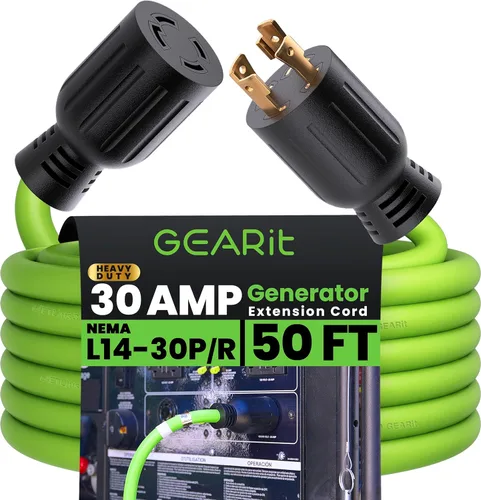 Cable de extensión de generador GEARit - Con múltiples opciones de longitud de hasta 100 pies, este cable de extensión de generador resistente es la opción perfecta para alimentar su hogar, vehículo o cualquier equipo esencial que necesite usar cuando no pueda acceder a la red eléctrica. El alambre de cobre libre de oxígeno y el diseño industrial aseguran un funcionamiento limpio y consistente. Potencia Consistente a Distancia - Este cable de extensión para generador transfiere potencia de hasta 30 amperios / 120 voltios / 7500 vatios a través de alambre de cobre premium 100% libre de oxígeno, la única opción para garantizar potencia limpia y fuerte cuando más importa. Ya sea una conexión corta de 6.6 pies o una carrera larga de 100 pies hasta un generador distante, este cable de extensión lo tiene cubierto. Diseño resistente a la intemperie: cuando se utiliza su generador para energía de emergencia, el clima es a menudo un factor importante. Es por eso que este cable de extensión del generador está listado por ETL para resistencia a la intemperie, por lo que puede mantener su hogar o vehículo funcionando durante tormentas severas y otros eventos climáticos mientras mantiene su generador a una distancia segura para evitar ruido y humos peligrosos. Conector de bloqueo giratorio para una conexión segura: cuando está alimentando un hogar o negocio, perder energía incluso por un momento puede ser una gran interrupción. Este cable de extensión para generador evita interrupciones con un enchufe de bloqueo giratorio, diseñado para permanecer en su lugar incluso cuando es jalado o golpeado por escombros de tormenta, mientras permanece ergonómico y fácil de quitar cuando se desea. Fácil de ver en la oscuridad: la chaqueta verde brillante ayuda a que este cable de extensión del generador sobresalga de la hierba, arbustos u otras obstrucciones, incluso de noche o en condiciones nubladas. Además de hacer que el cable de extensión sea fácil de localizar, esta función también protege de accidentes y tropiezos, asegurando la seguridad para usted, su familia o clientes en su negocio.