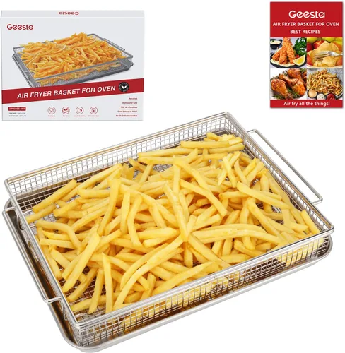 【Fríe al aire todo en tu horno】 La bandeja crisper Geesta con canasta elevada mejorada es más estable y menos tambaleante, y la canasta no se deslizará por la bandeja para hornear. La cesta de malla permite que el calor de convección alcance todos los ángulos de la comida y circulación de flujo de aire de 360 grados, sin necesidad de voltear tu comida. 【No más revestimiento que se descascara】 Cuando el revestimiento comienza a desprenderse, ¡probablemente estás comiendo el revestimiento al sacar tu comida, lo cual no puede ser seguro! Nuestra cesta para freír al aire y bandeja para hornear están fabricadas con acero inoxidable de alta calidad apto para alimentos, brindándole seguridad en cada comida. La bandeja inferior transfiere bien el calor, no es fácil de doblar ni deformar, lo que garantiza un uso a largo plazo. 【Le ofrece una cocina más saludable】 Funciona bien con horno freidora de aire y la mayoría de los hornos de convección, abre la posibilidad de cocinar rápidamente comidas deliciosas sin mantequilla ni aceite adicionales. Es el compañero de cocina perfecto para personas con dietas bajas en calorías o necesitan reducir sus niveles de colesterol. No más desorden en tu cocina: no más derrames para mantener tu horno limpio, recoge todo tipo de migas, escamas, goteos y salpicaduras. La bandeja para freír al aire sin adherencia permite una limpieza rápida y fácil, simplemente coloca tu bandeja en el lavavajillas o límpiala con un paño para una limpieza rápida. ¡Qué cambio de juego! 【Usos versátiles】 Este juego de dos piezas se convertirá en tu juego de utensilios para hornear favorito para cocinar en el horno. ¡Ideal para galletas, tocino crujiente, patatas fritas, chuletas de cerdo, tater tots, pizza, camarones, verduras, pollo frito y mucho más! La cesta de ensalada también es perfecta para la parrilla, cocina uniformemente y deliciosamente tierno maíz, cebollas, hongos, pimientos, carne y más.