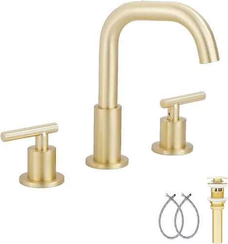 GGStudy Caño giratorio de 360°, 2 asas, 3 agujeros, 8 pulgadas, grifo de lavabo de baño de oro cepillado a juego con drenaje desplegable