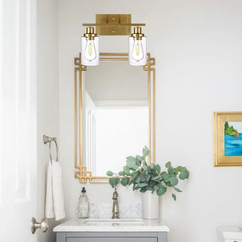 Brass Bathroom Vanity Light 2 Light Farmhouse Bathroom Lighting Fixtures Over Bath Makeup Mirror Wall Sconce with Clear Glass Shades for Bathroom