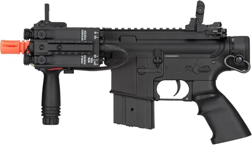 Caja de cambios de metal completo con componentes metálicos reforzados para mayor potencia y durabilidad, junto con el nuevo motor de par ultra alto rediseñado de JG para una increíble velocidad de disparo de más de 1,000 rondas por minuto con una batería de Li-Po Tamaño subcompacto, perfecto para entornos CQB Caja de batería externa grande, con batería incluida 10.8v 1100mah Sistema de riel integrado de metal completo para mayor comodidad al agregar accesorios como láseres, luces, agarres delanteros, etc Miras delanteras y traseras ajustables abatibles incluidas Barril de metal de calibre apretado para mayor precisión y potencia Cargador de metal de alta capacidad de 190 rondas incluido Sistema de salto ajustable Agarre táctico de goma estilo SPR