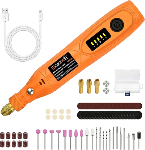Control de precisión de 5 velocidades (5,000-18,000 RPM): la herramienta giratoria inalámbrica tiene 5 opciones de ajuste de velocidad (5000/8000/11000/14000/18000 revoluciones por minuto), cambia sin esfuerzo entre perforación de alta velocidad y grabado de baja velocidad, haciendo que este mini giratorio inalámbrico herramienta ideal para trabajos delicados en madera, vidrio, plástico y metal Juego de accesorios de 105 piezas con mandriles de varios tamaños (0.098 pulgadas, 0.118 pulgadas, 0.118 pulgadas). Los mandriles de precisión a juego permiten el cambio de brocas sin herramientas para bolígrafos de grabado, tambores de lijado y brocas sin herramientas y mucho más. Tendrás todas las herramientas necesarias para completar cada tarea de bricolaje. Y está equipado con una caja de almacenamiento de accesorios, por lo que es conveniente para transportar y almacenar Carga USB-C y tiempo de funcionamiento de 200 minutos (batería de iones de litio de 3.7 V) : recarga en cualquier lugar a través del cargador de teléfono, banco de energía o computadora portátil, con un indicador LED verde para carga completa y sesiones de manualidades ininterrumpidas Diseño ultracompacto y ergonómico (6.35 oz, agarre estilo bolígrafo). Perfecto para intrincadas tareas de grabado como pulido de joyas, grabado de vidrio, perforación de cerámica y tallado de madera fina Libertad verdaderamente inalámbrica (mini kit de herramientas giratorias): sin cables, sin límites. Lleva tu kit de herramientas rotativas a cualquier lugar: taller, viajes o proyectos al aire libre. Diseñada para aficionados y profesionales por igual, esta mini herramienta giratoria ofrece resultados de grado profesional sin el volumen