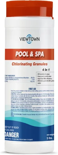 Potente desinfectante de piscina y spa: mata eficazmente bacterias y algas, asegurando agua cristalina para tu piscina y spa. Guía de dosificación fácil de usar: utiliza 5 libras por 60,000 galones de agua. Tratamiento de choque para su piscina semanalmente o después de un uso intenso, altas temperaturas o lluvia para obtener los mejores resultados. Versátil y compatible: seguro para todas las superficies de piscina, incluyendo vinilo, yeso, fibra de vidrio y azulejos. Adecuado tanto para piscinas de cloro como de agua salada. Disolución Rápida y Acción Rápida: Nuestros gránulos se disuelven rápidamente, permitiéndole tratar su piscina o spa — no se requiere tiempo de espera prolongado. Alta calidad y fiable: con un 60% de cloro disponible, nuestro producto garantiza un saneamiento eficaz sin dejar residuos, manteniendo tu piscina o spa seguro y limpio.
