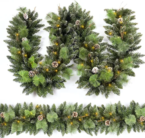 Guirnalda navideña preiluminada de 9 pies con 50 luces LED, guirnalda navideña estilo cono de pino y nieve, para interiores y exteriores