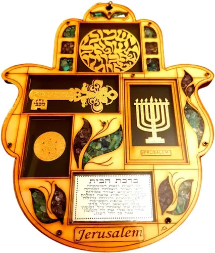 Bluenoemi Regalos de Israel: Hamsa de madera con símbolos. Bendición para el hogar - en hebreo. Decoración de pared de protección Hamsa Good Luck. Placa de madera hecha a mano que se verá fabulosa en tu hogar o sería un regalo considerado. La hamsa de madera está decorada con piedras semipreciosas. La hamsa mide 8.7x7.5 in. Su pedido será enviado con una bendición en inglés. Acerca de la hamsa: Un amuleto en forma de mano popular en todas las religiones y comúnmente utilizado en joyas y tapices.Un signo de protección en muchas sociedades a lo largo de la historia, el hamsa proporciona una defensa supersticiosa contra el mal de ojo. Bendición del hogar para el hogar. Que este hogar sea bendecido con amor. Que este hogar sea bendecido con paz. Que este hogar sea bendecido con alegría, felicidad y éxito"