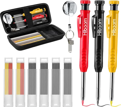 Bonita combinación para carpintería: recibirás 3 lápices de construcción sólida con sacapuntas integrado, 24 recambios negros de 0.945 x 0.110 in, 6 repuestos amarillos de 0.110 in, 6 repuestos rojos de 0.110 in, 1 soporte retráctil resistente con clip para cinturón y 1 estuche de lápices de gran capacidad. Este juego de lápices mecánicos de carpintero es conveniente para trabajos de marcado de carpintero, ideal para arquitectos, carpinteros y maquinistas, se puede llevar y aplicar en cualquier momento, y ya no te preocupes por perder bolígrafos Lápices mecánicos de carpintero mejorados: los lápices de construcción de agujeros profundos adoptan un diseño de punta alargada de 1.772 pulgadas por lo que es más fácil marcar en áreas estrechas donde otros marcadores de carpintería no pueden alcanzar. 3 colores de repuesto distinguen las marcas con diferentes significados y permiten marcar en superficies oscuras. El afilador integrado siempre mantendrá la punta afilada para un trabajo de precisión. Estos lo convierten en el lápiz de construcción ideal para carpinteros y similares, así como para todos los demás oficios Soporte retráctil resistente: el material principal del soporte para bolígrafos de carpintería es metal, resistente al desgaste e irrompible; el alambre de acero retráctil interno, la superficie está recubierta para proteger tus manos; la longitud del cable de acero es de aproximadamente 27.5 pulgadas, que es más larga que los soportes normales para bolígrafos, más adecuado para el uso diario. Simplemente desliza el bolígrafo en el soporte elástico para lápices y luego fija el clip de metal en el bolsillo o trabilla del cinturón para dejar una marca sin quitar el bolígrafo Estuche para lápices de gran capacidad: el tamaño es de 8 x 3.1 x 2.3 pulgadas, con gran capacidad de almacenamiento, puede almacenar hasta un juego completo de bolígrafos para carpintería. Nuestro estuche está hecho de material de tela Oxford, que es duradero, altamente resistente al desgarro y ligero. La bolsa de malla en la bolsa de lápices puede ayudarte a separar cosas pequeñas, como borradores, grapadoras, etc. Las correas ajustables no solo mantienen el bolígrafo en su lugar, sino que también pueden contener más bolígrafos. Este es el gran complemento para guardar tus bolígrafos de carpintería Amplio uso: el soporte de resorte elástico hace que el soporte retráctil para tarjetas sea adecuado para colocar lápices de carpintería y otros tipos de bolígrafos, lo que puede evitar eficazmente perder bolígrafos mientras se encoge automáticamente para un trabajo diario más fácil. También son adecuados para todo tipo de bancos de carpintería, almacenes, talleres y sitios de construcción, y son muy apreciados por los carpinteros, trabajadores de la construcción, trabajadores de bricolaje, artesanos, constructores, etc