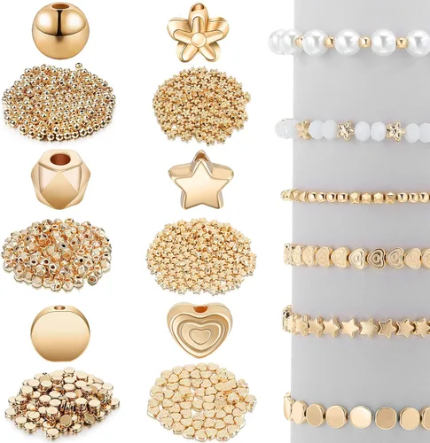 Hicarer Juego de 1200 cuentas espaciadoras doradas, kit de fabricación de pulseras de cuentas para hacer joyas, cuentas de poni de flores redondas