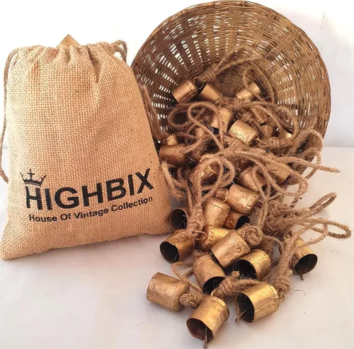 HIGHBIX Campanas de vaca de metal de estaño rústico vintage de 1.6 in, hechas a mano, con cuerda de yute (30 unidades, cilindro)